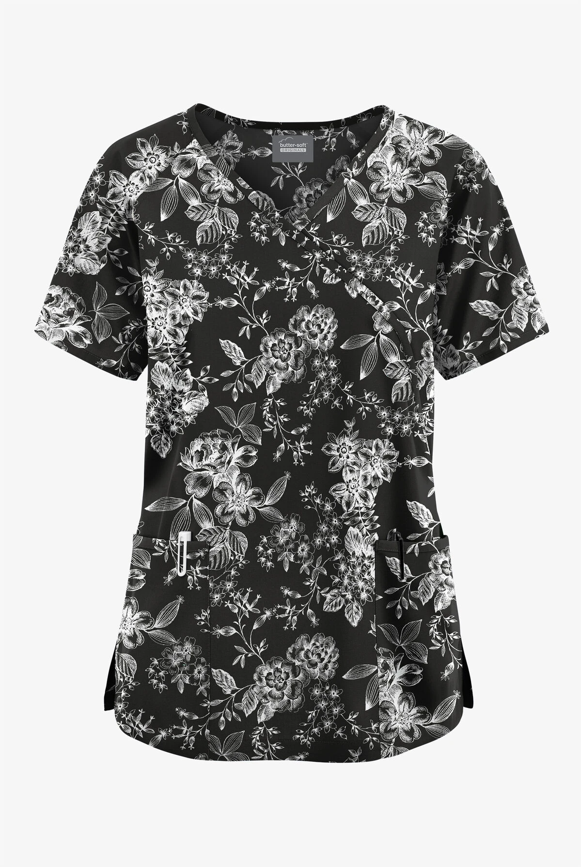 Featuring a worry-free mock wrap style (sewn shut!), our new scrub top offers a flattering fit with an adjustable tie at the back. Side vents keep it comfy around the hips, and patch pockets are there for the essentials.