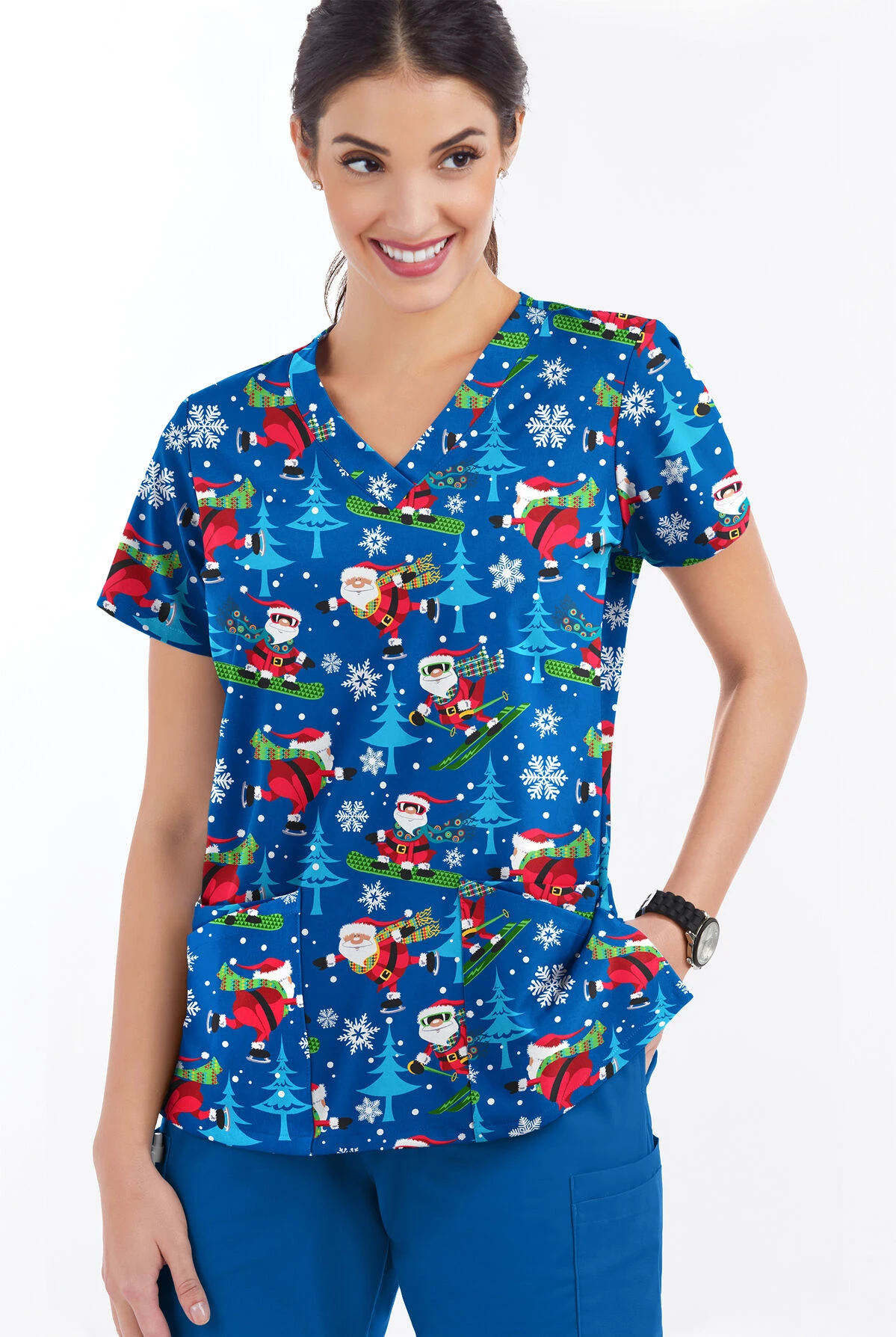 Butter-Soft Santa On Vacation Royal Women’s 4-Pocket Rounded V-Neck Printed Scrub Top