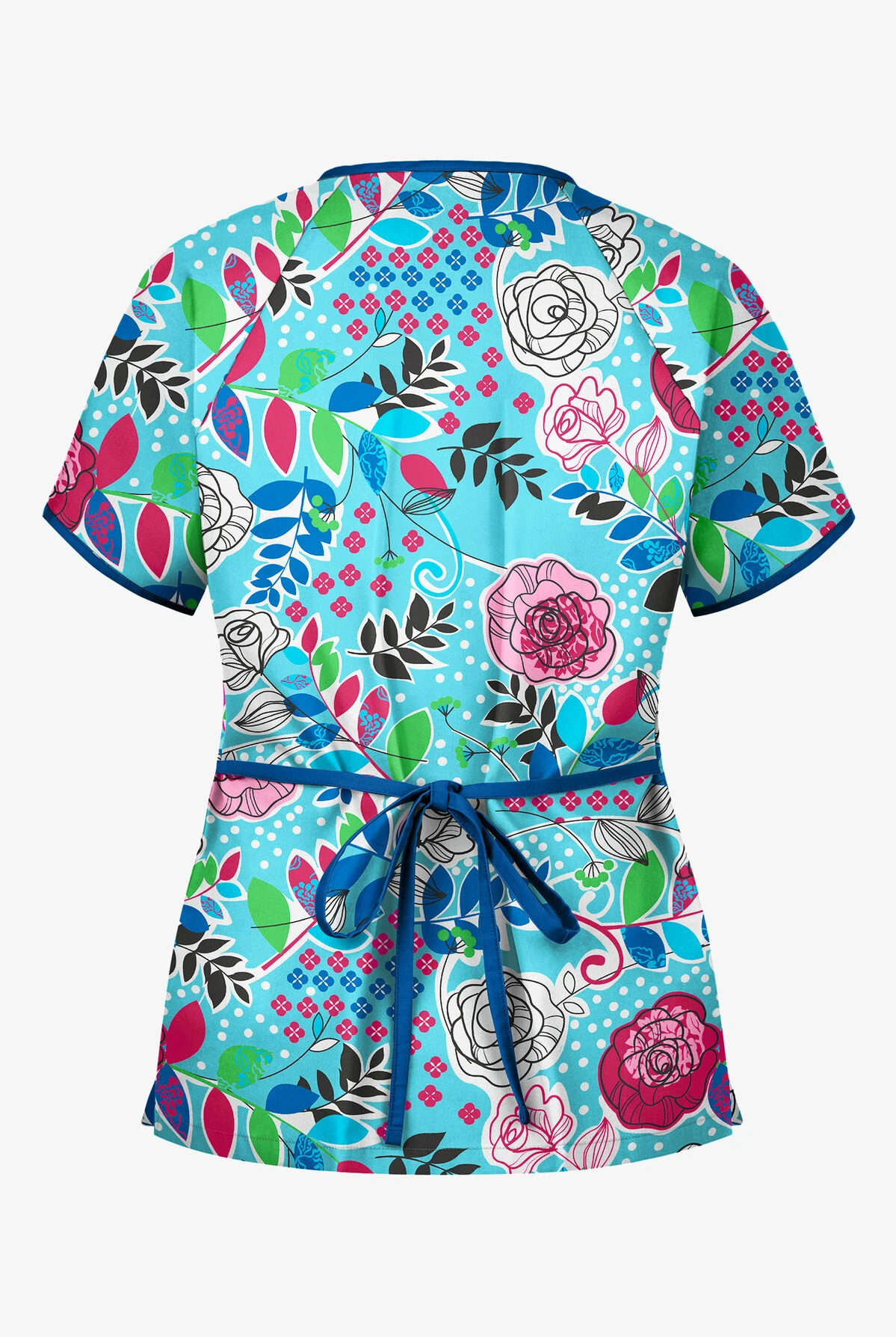Featuring a worry-free faux wrap style (sewn shut!), our new scrub top offers a flattering fit with an adjustable tie at the back. Side slits keep it comfy around the hips, and two patch pockets aer there for the essentials. Ever seen a japonica flower? You have now! They’re those big, beautiful pink and gray blooms.