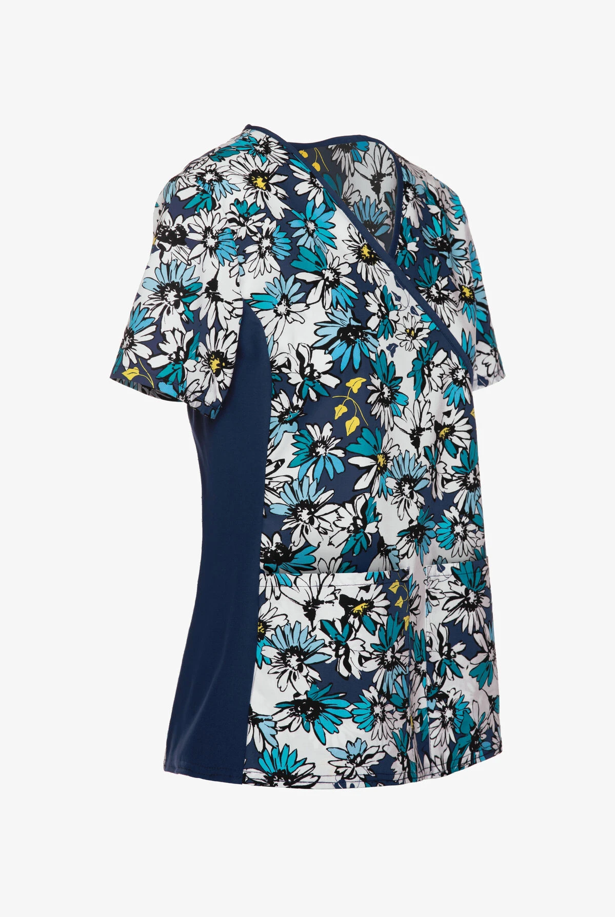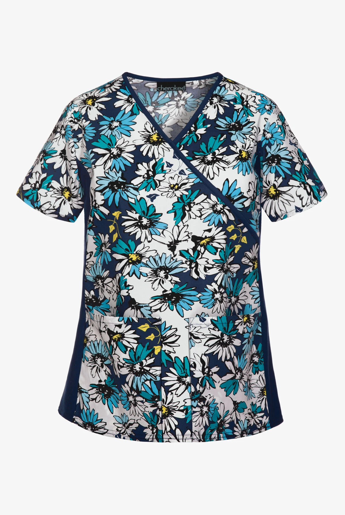 Cherokee Flexibles Bold Blooms Women’s 2-Pocket Mock Wrap STRETCH Print Scrub Top