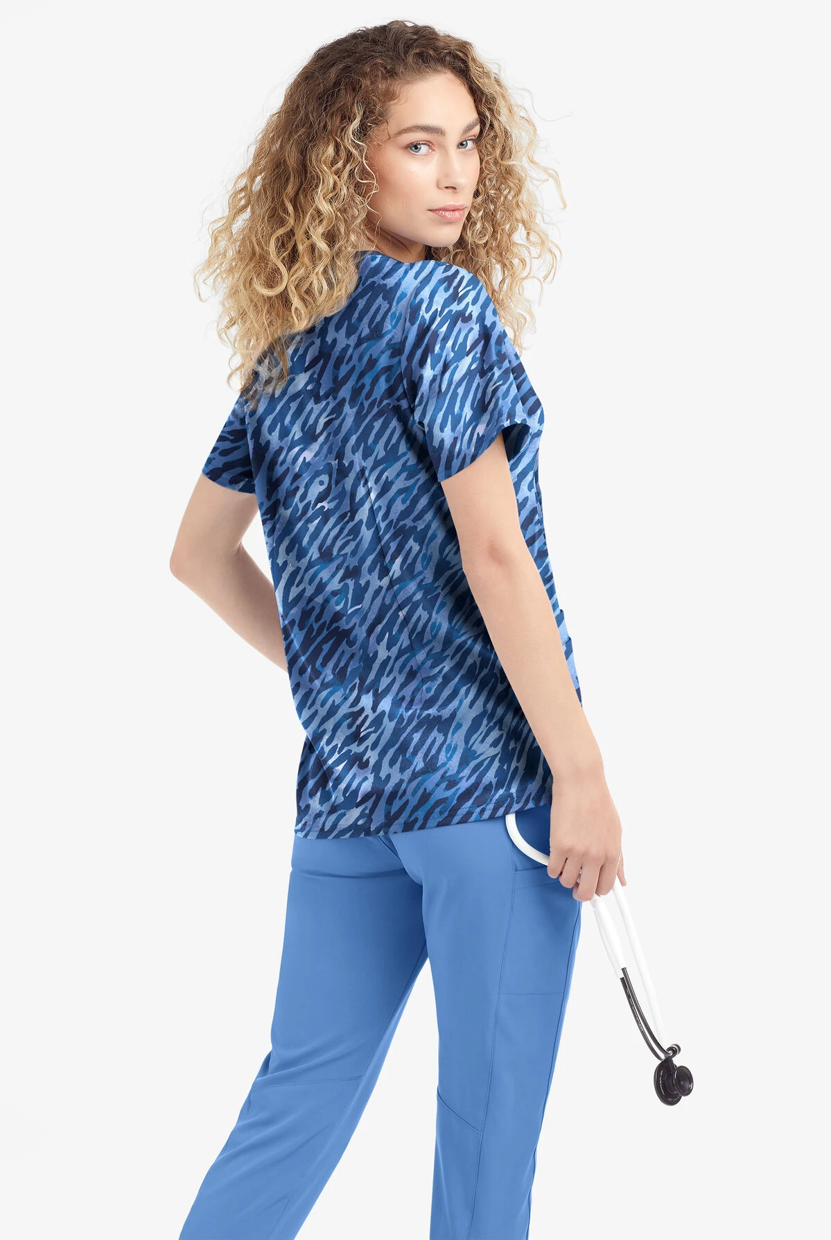 Versatility! You love it and so do we. A shiny nickel zipper at the curvy v neckline of this cute top gives you styling options. Darts front and back give it great shape. And pockets!