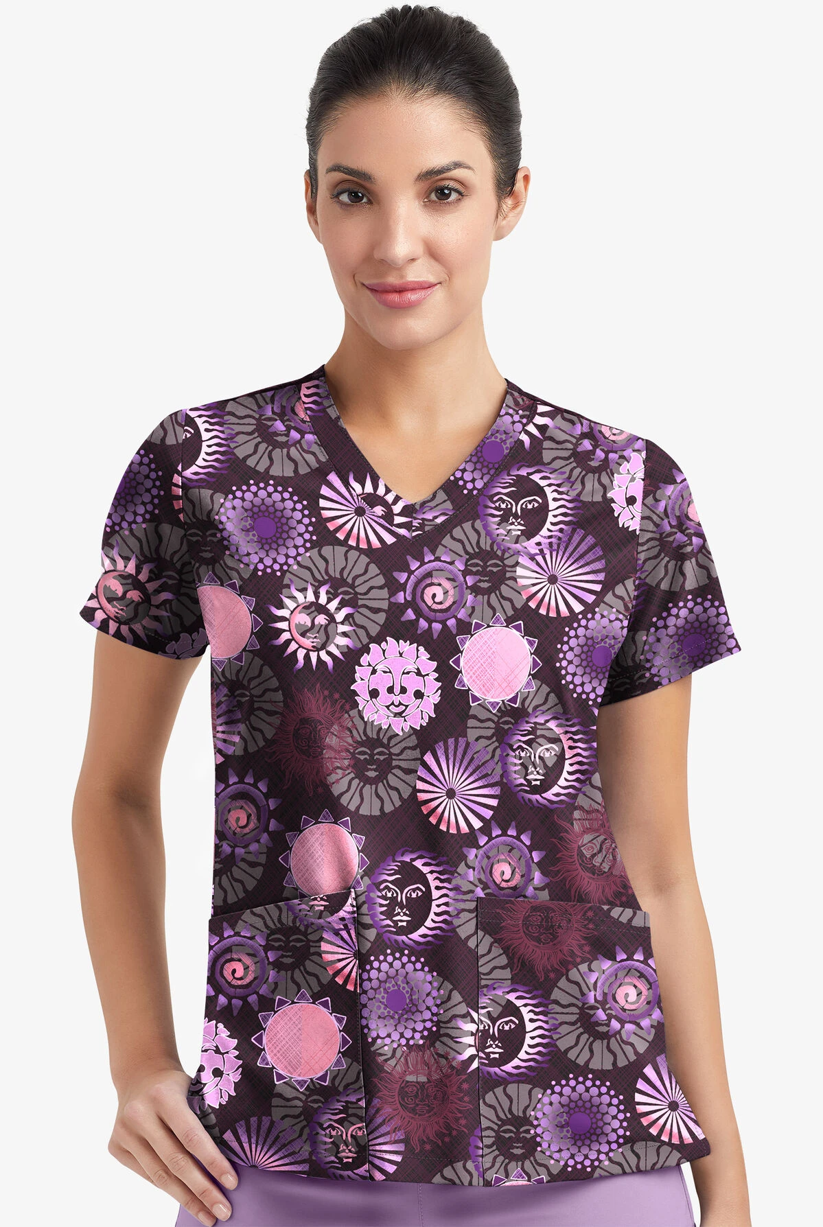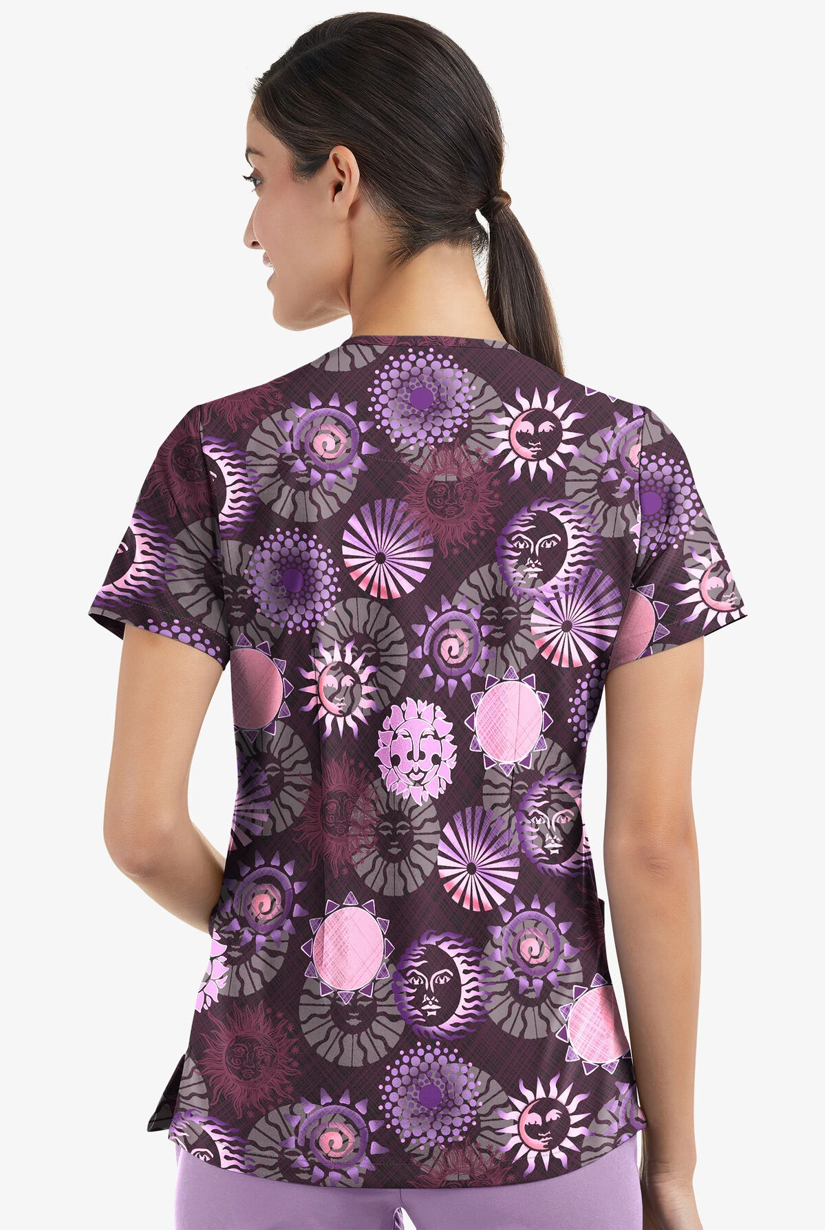 The v neckline is classic for a reason—it’s almost universally flattering. Other flattering things about this top? Back vents and side vents. They add shape and ease, respectively.. Are they flowers? Stars? This black-ased print is 100% in the eye of the beholder.