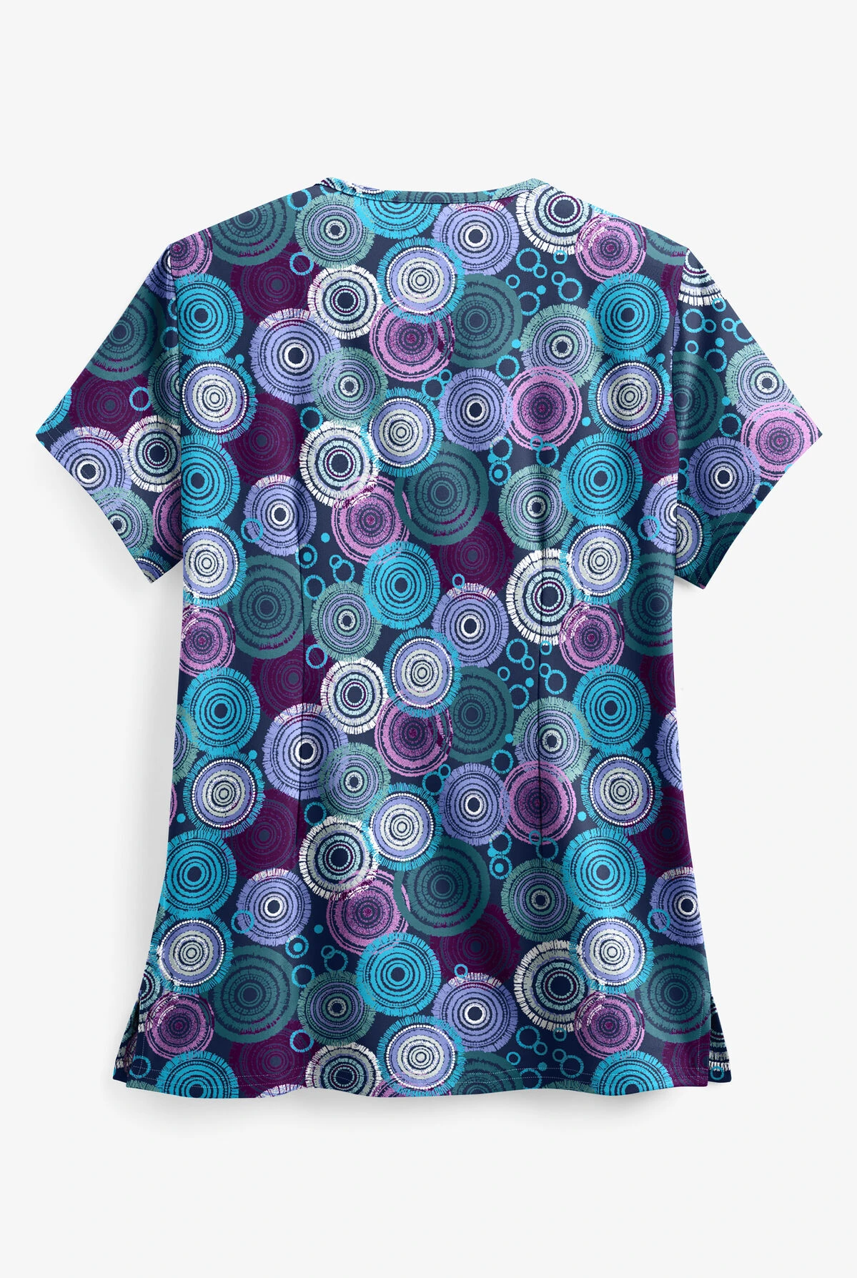This modern fit Easy Stretch by Butter-Soft™ mandala tapestry navy women’s 4-pocket zipper neck print scrub top features a curved neckline with a 3″ zipper opening, front princess seams, back darts, and side vents. This stylish top has 4 patch pockets for all your storage needs. The silver rivets at the pocket corners provide additional accent. Made of 93/7 poly/spandex. the approximate length for size m is 27.5″.