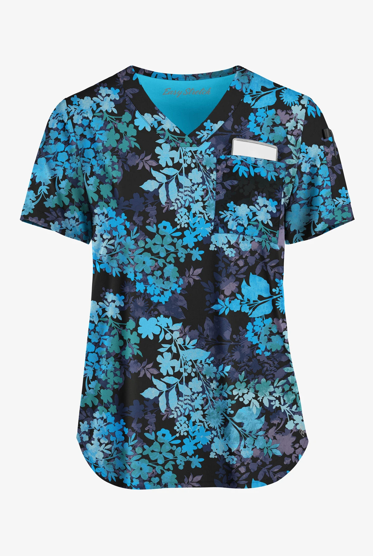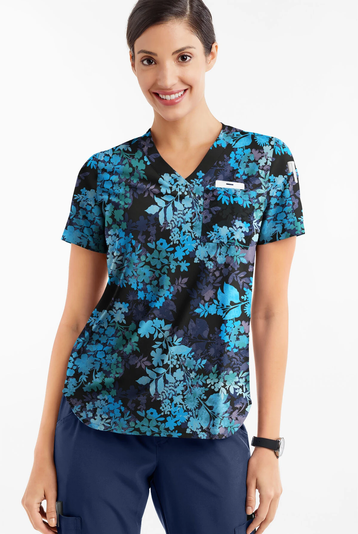 If you like the option to tuck your tops in or wear them loose, our v-neck tuck-in scrub top is made for you! Polished shape and fabric lend themselves well to the perfect tuck every time. Easy Stretch by Butter-Soft scrub collection is designed for a modern look and easy fit for very long shifts and made with performance 4-way stretch comfort fabric. Clustered floral in shades of blue on a black background? Lovely!
