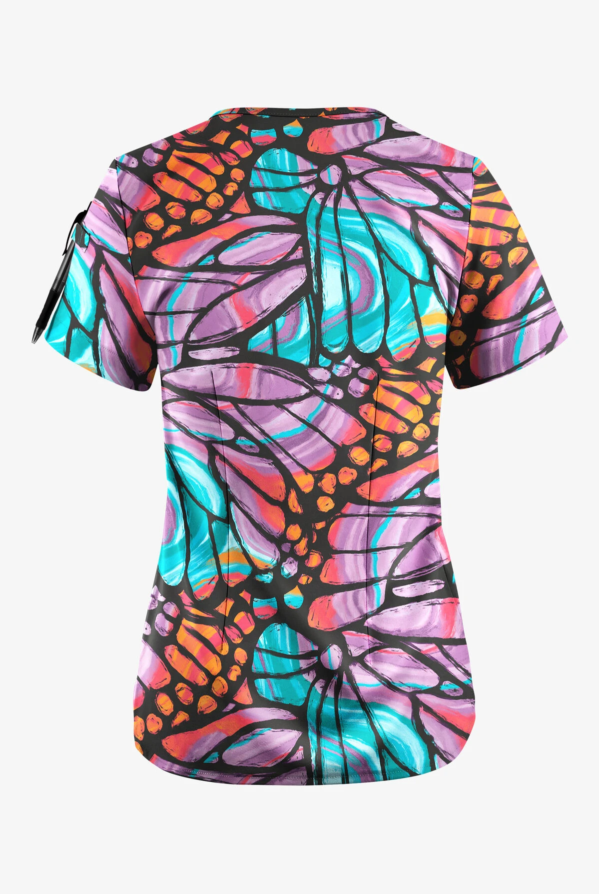 - Features a butterfly print with a stained glass feeling