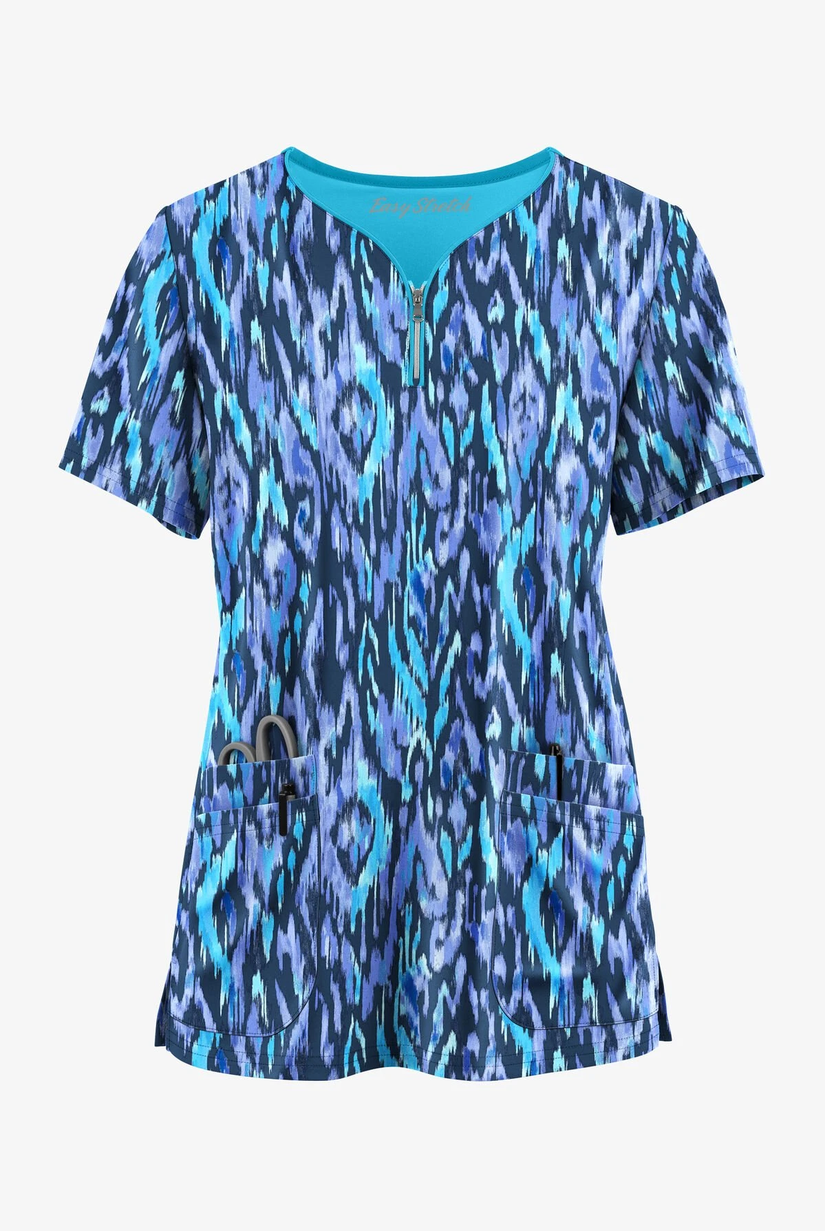 Versatility! You love it and so do we. A shiny nickel zipper at the curvy v neckline of this cute top gives you styling options. Darts front and back give it great shape. And pockets! We love the soft-around-the-edges nature of an ikat print. This one’s sort of swirly. Pretty in blue.