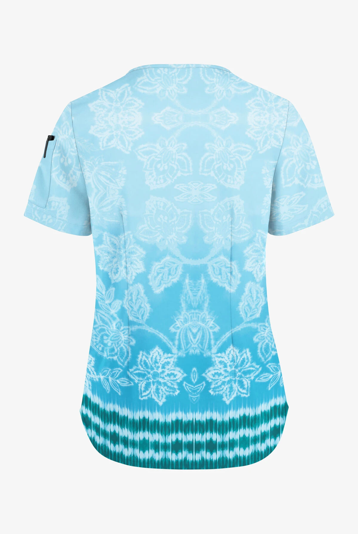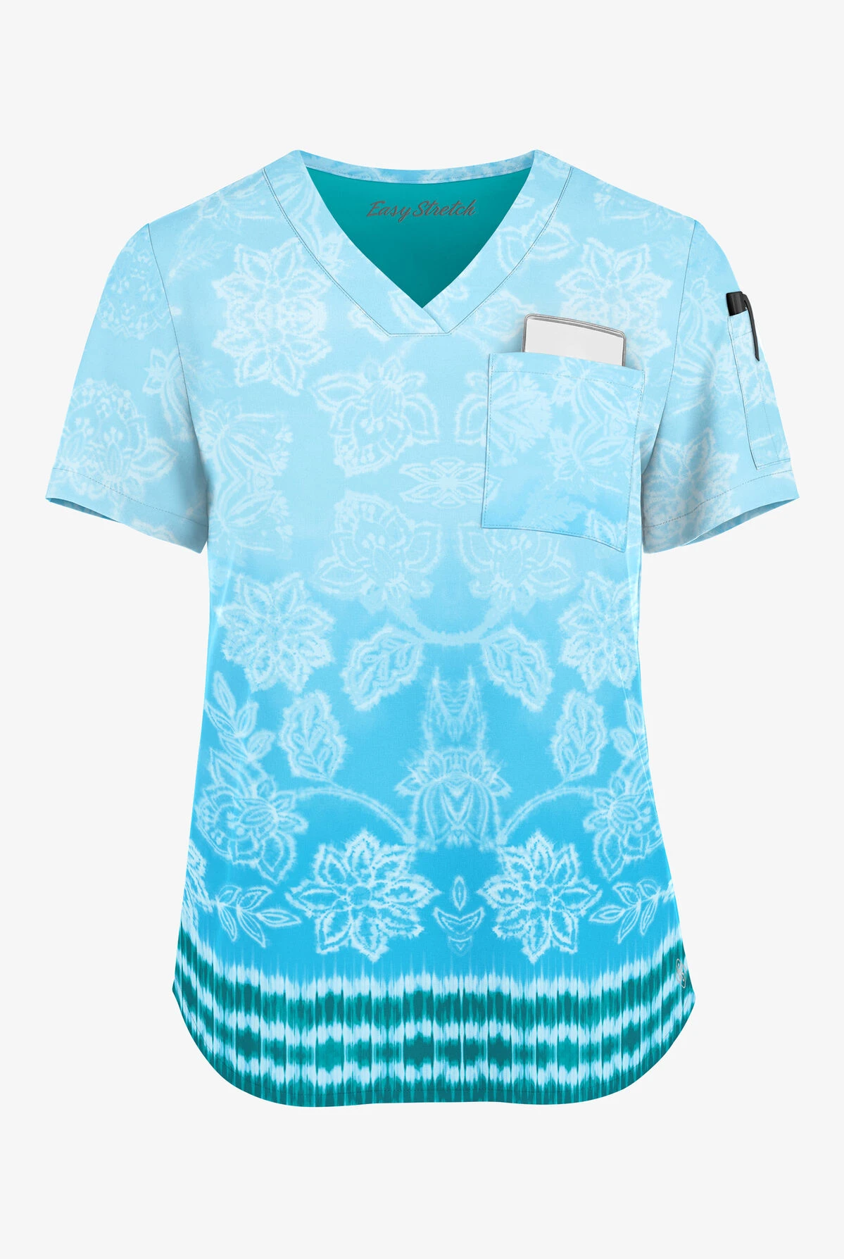 The Easy Stretch by Butter-Soft™ tinted blossoms turquoise women’s 1-pocket tuck-in print scrub top features a contemporary fit with a flattering curved v-neck and back darts for a more tailored fit. For storage, you will find a double pen pocket on left sleeve and a single chest pocket. The style can be worn tucked-in or out. Made of 93/7 poly/spandex.