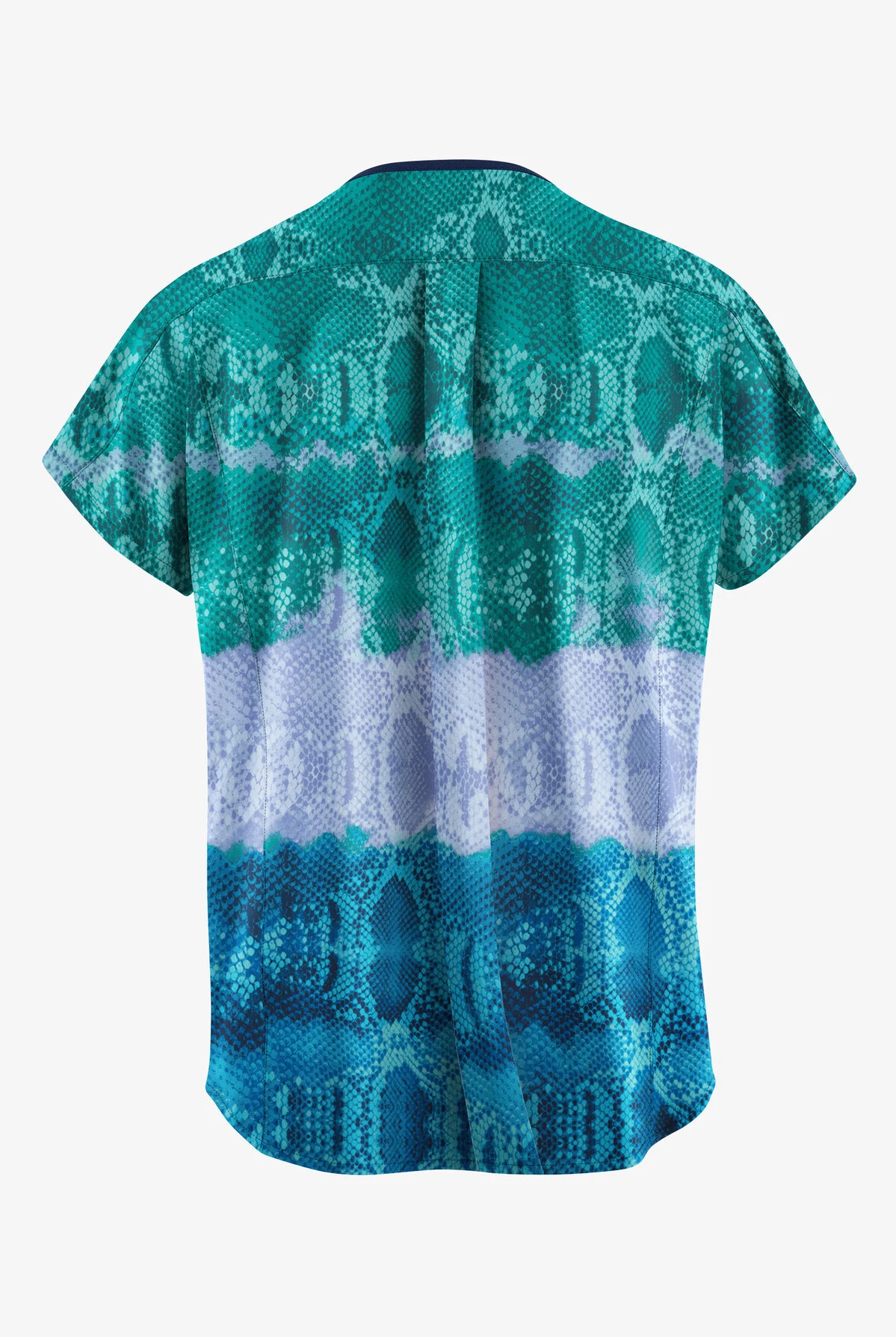 You may not have heard of a dolman sleeve, but you’ll love the comfort. No seam at the armhole means nothing rubs you wrong. You’ll love the details too – including a relaxed fit and sleek onseam zip pockets. The Easy Stretch by Butter-Soft™ collection is designed for a modern look and easy fit. 4-way stretch performance fabric keeps you comfortable all shift long. Shades of blue and teal make this border print especially distinctive.