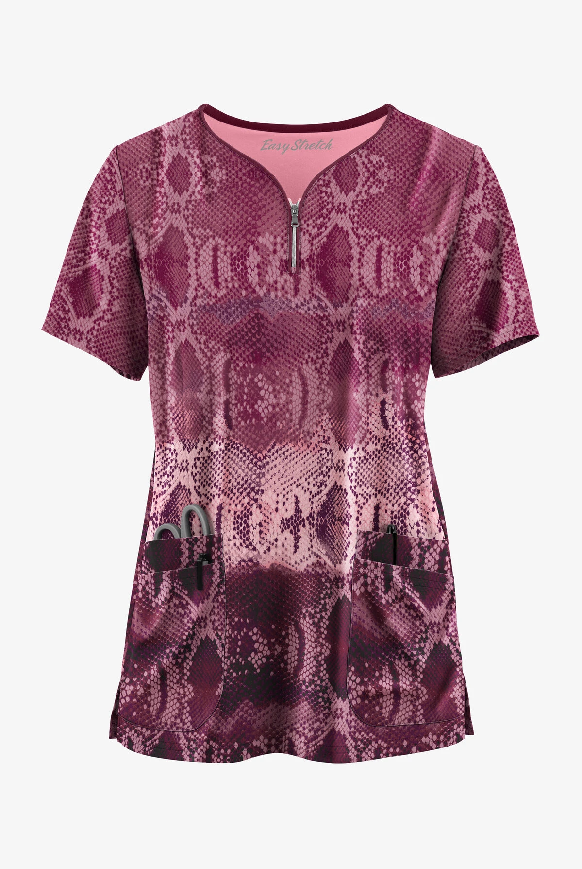Versatility! You love it and so do we. A shiny nickel zipper at the curvy v neckline of this cute top gives you styling options. Darts front and back give it great shape. And pockets! Shades of pink and wine make this border print especially distinctive.