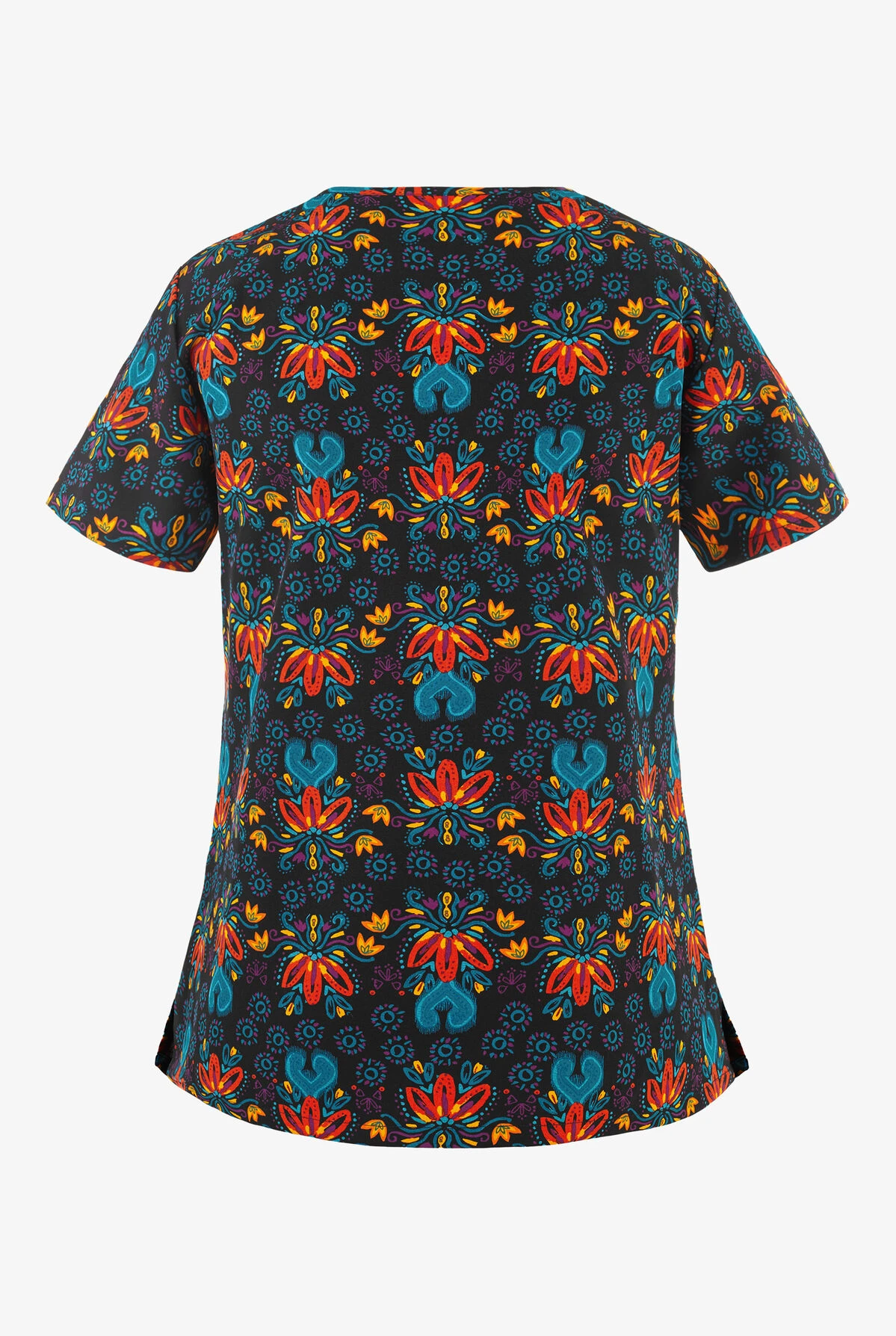 The Green Town UA-501-1418B Ethnic Floral V-Neck Print Scrub Top features a self fabric banded v-neckline, side slits and 3 pockets; 2 front patch pockets and 1 inner slip pocket and bungee loop on right. Approximate length of Medium is 27″. Fabric content is 93/7 poly/spandex.