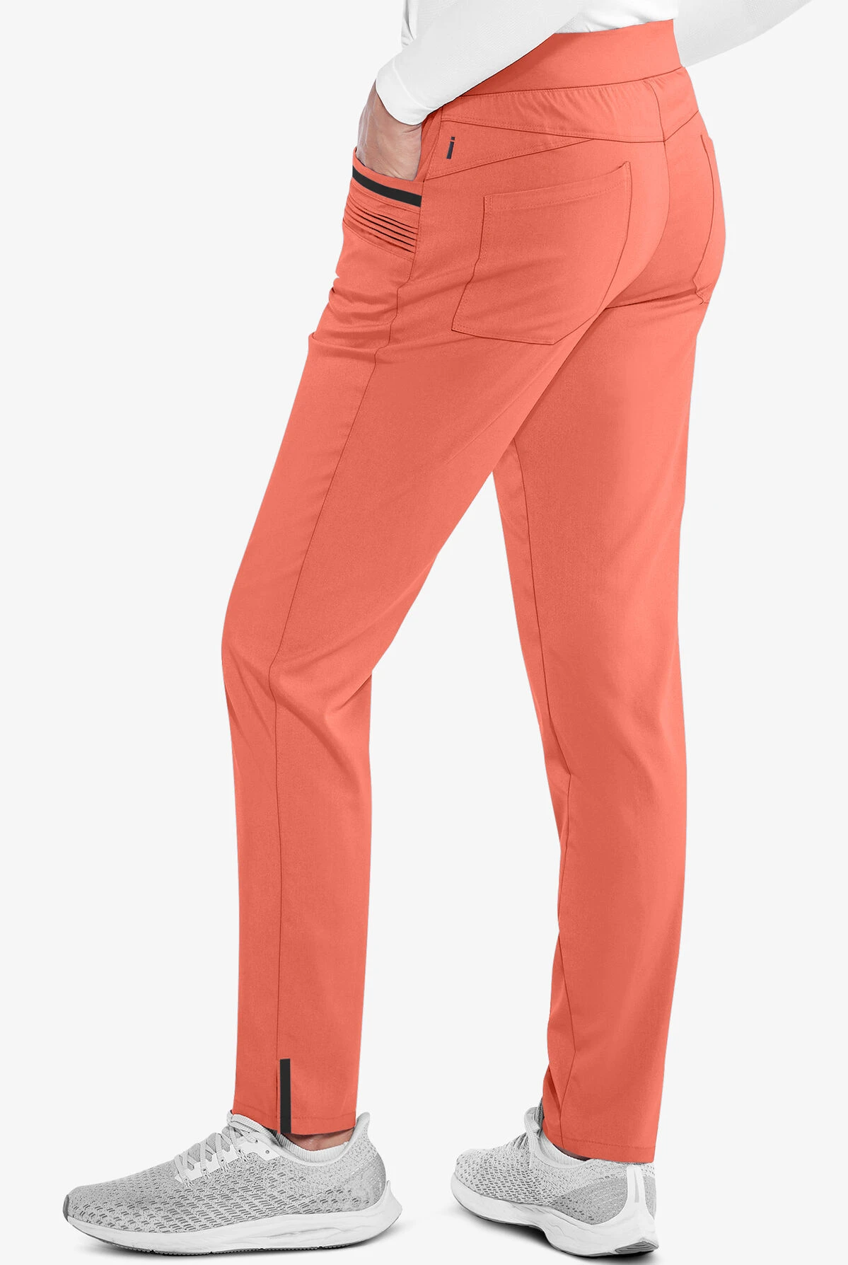 - Flat front waistband with tab, inner drawstring and knit elastic back