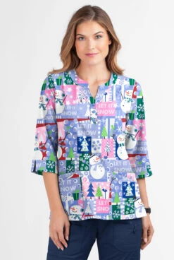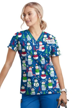 Butter-Soft Joyful Snowman Women’s 2-Pocket Round Neckline Print Scrub Top