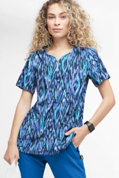 Easy STRETCH By Butter-Soft™ Rotterdam Ikat Navy Women’s 4-Pocket Zip Curved Neck Print Scrub Top
