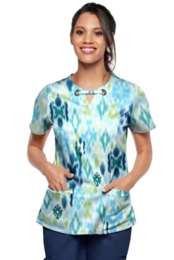 UA Butter-Soft STRETCH Varna Ikat Turquoise Women’s 4-Pocket Grommet Printed Scrub Top