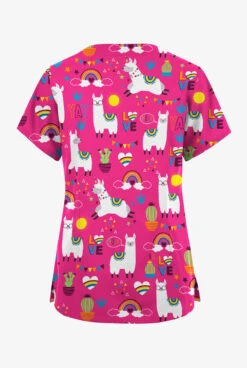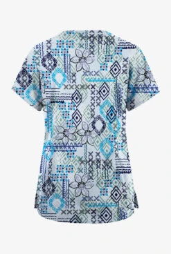 The UA Christmas Cookies Navy Mock Wrap Print Scrub Top is sewn closed in the front and can be cinched as much or as little as you like with the back ties. It features 2 front pockets and tacked down V-neck at center front chest. It also features Gecko Green trim along the wrap line, pockets, and sleeve edges. Fabric is made up of 55/45 cotton/poly blend.