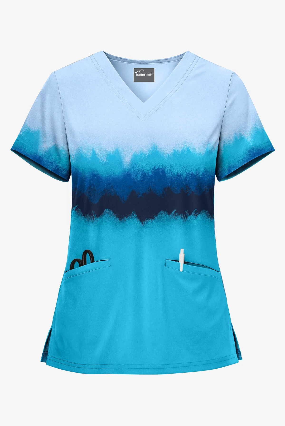 The UA Butter-Soft Painted Stripes Turquoise Women’s 2-Pocket V-Neck Print Scrub Top features a classic fit with a flattering shaped V-neck. It has 2 roomy angled welt pockets. The top also includes side vents for ease of movement during long days. The top has back darts for better fit. Also, it has a double needle top-stitch throughout. Made of 97/3 poly/spandex.