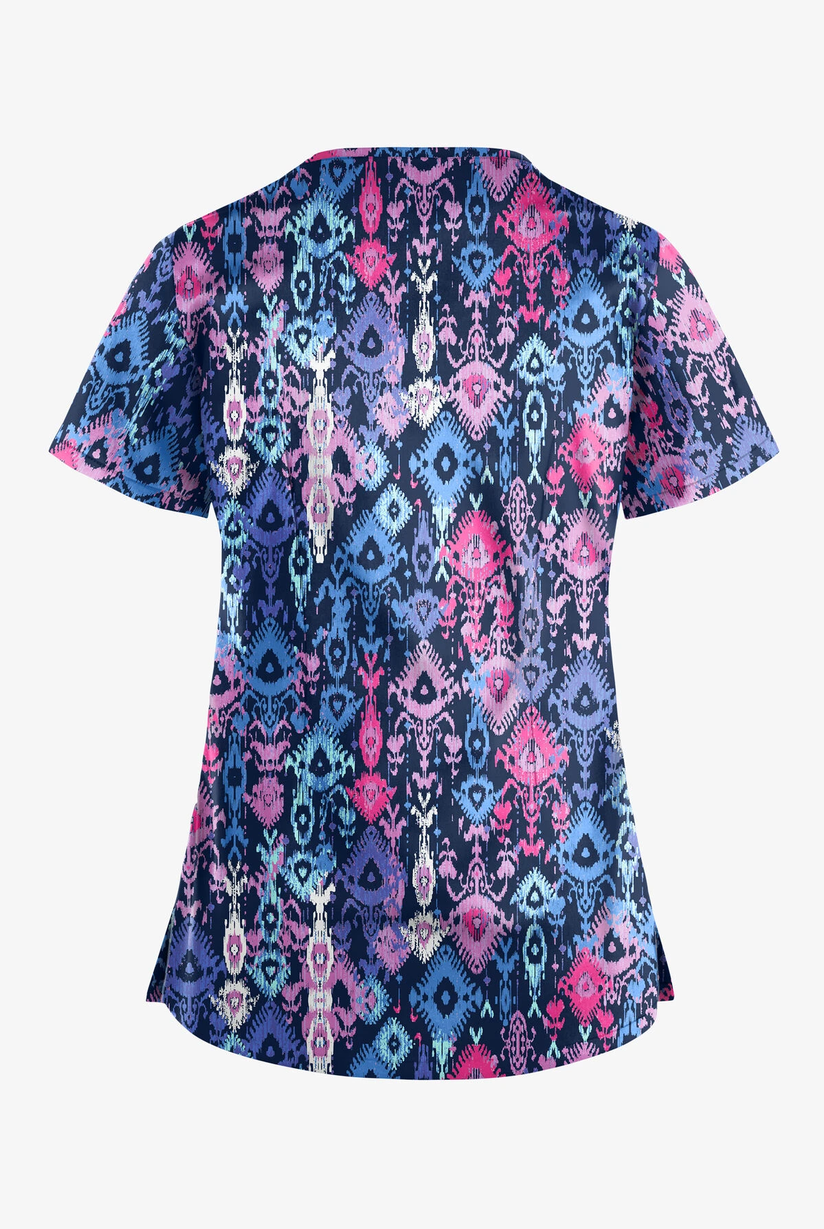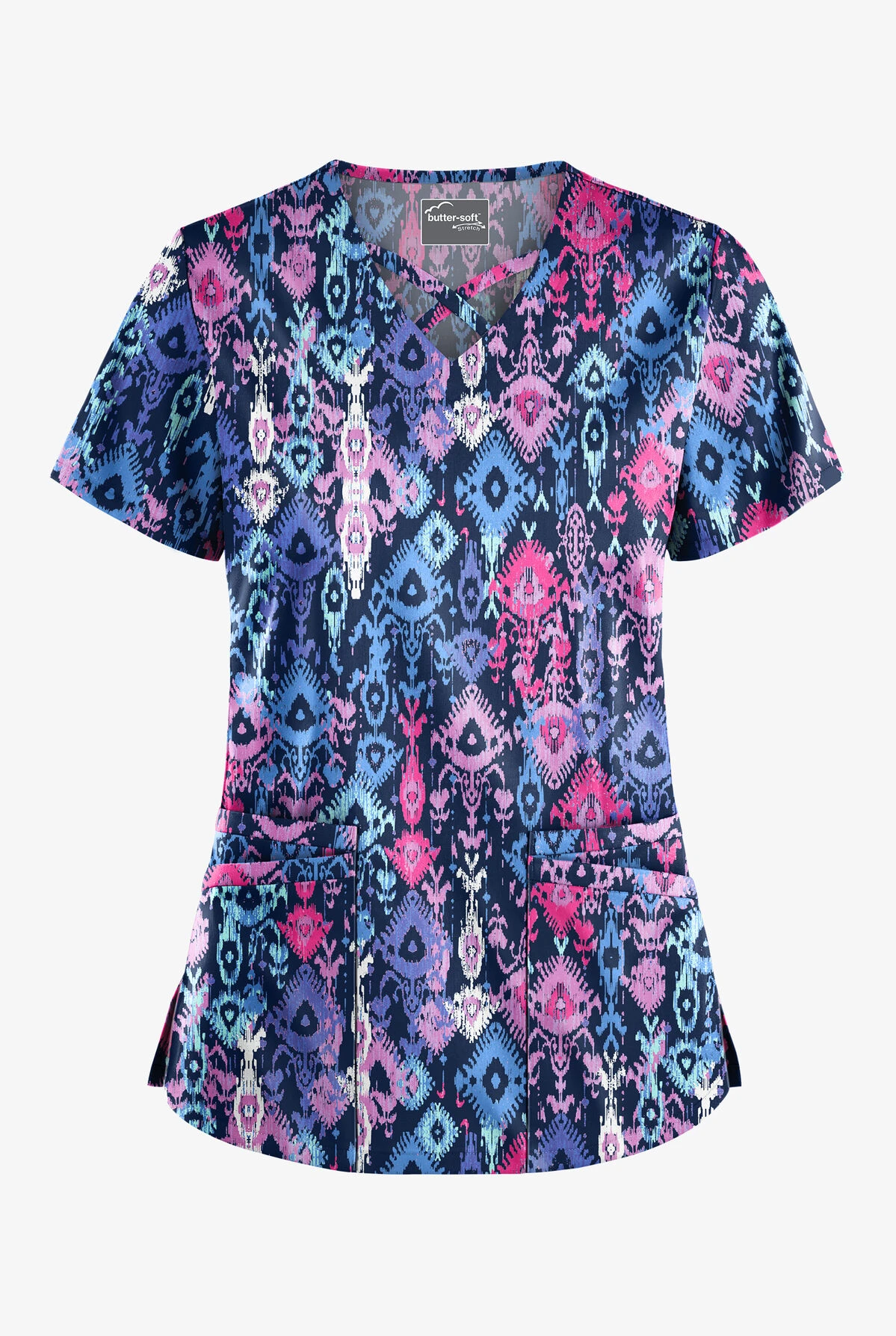 The UA Butter-soft Stretch cascading ikat rosebud women’s 4-pocket criss cross print scrub top features a tailored fit through the chest, back darts, and a sophisticated criss cross trim detail on the bottom of the rounded v-neckline. For all your storage needs, there are 4 front pockets, and the side slits make this top flexible for all day wear. Made of 93/7 poly/spandex.