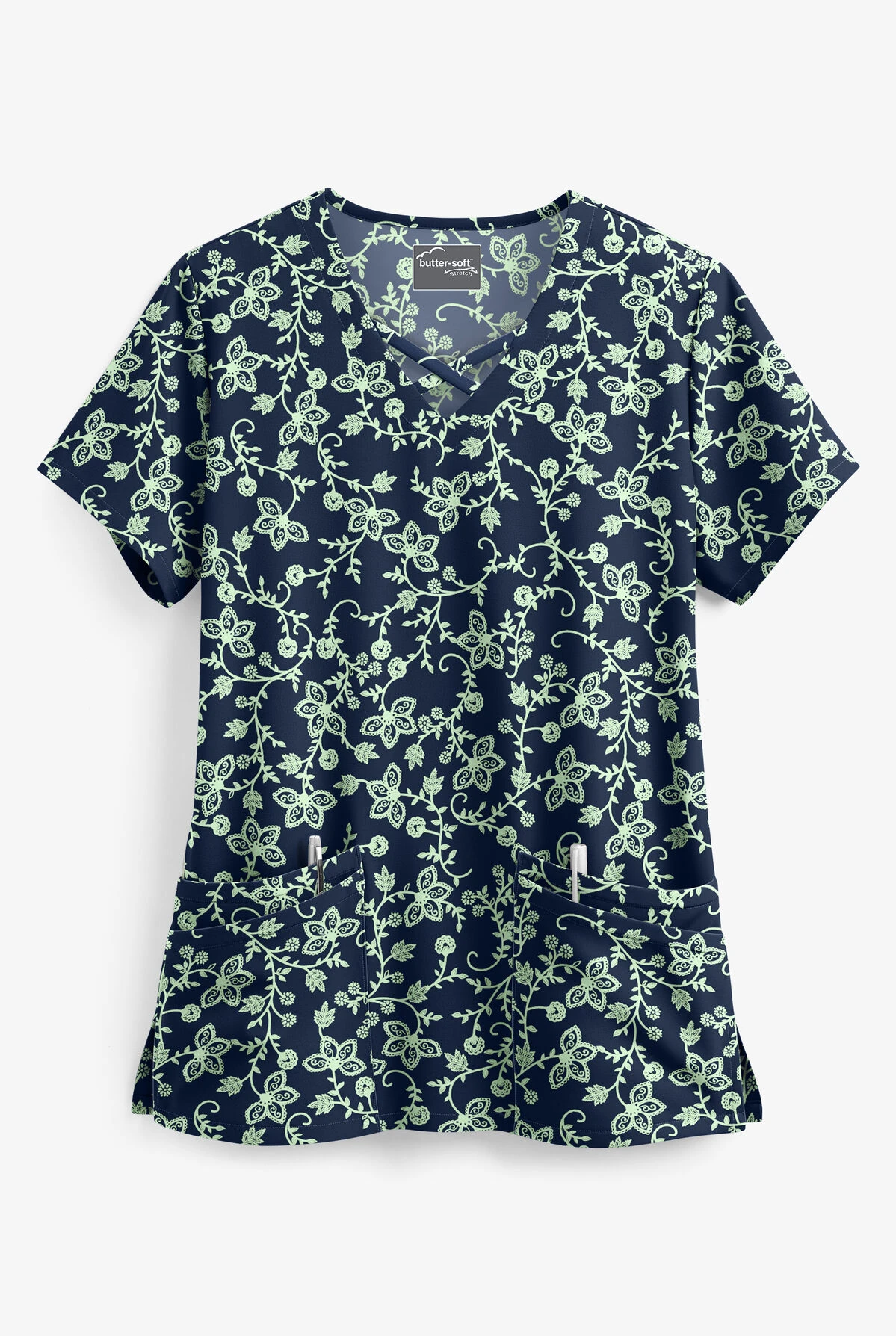 The UA Butter-soft Stretch floral vines navy criss cross print scrub top features a tailored fit through the chest, back darts, and a sophisticated criss cross trim detail on the bottom of the rounded v-neckline. For all your storage needs, there are 4 front pockets, and the side slits make this top flexible for all day wear. Made of 97/3 poly/spandex. The approximate length for size m is 27.5″.