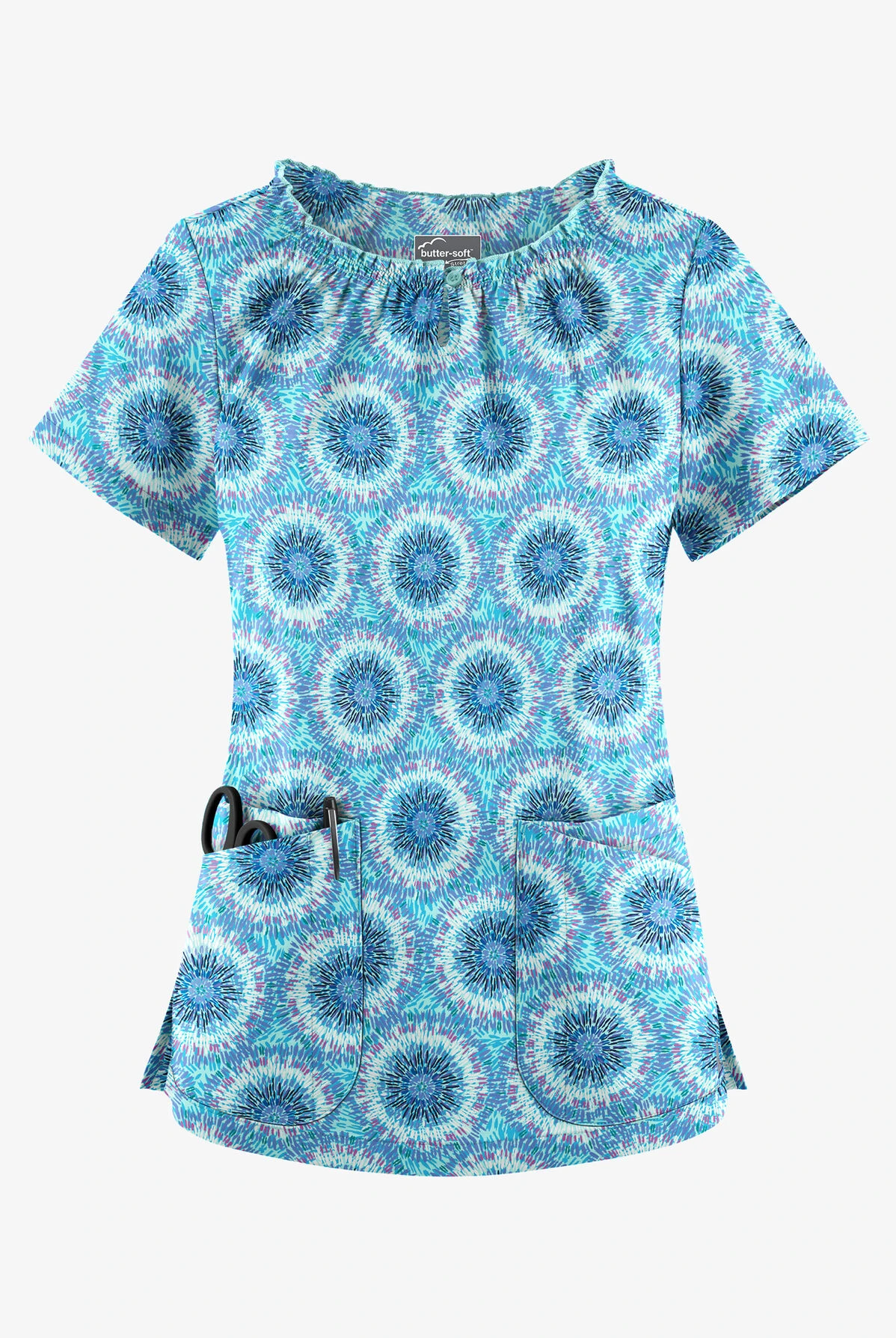 This UA Butter-soft Stretch splash of geo aqua moon women’s 6-pocket peasant style print scrub top features a modern fit and a gently gathered neckline with a key-hole button closure. It has 6 total pockets; 4 large front pockets and 2 pen pockets. Darts in the back for fit. Side vents for ease of movement. Made of 93/37poly/spandex.