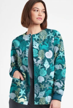 Butter-Soft Originals Beach Day Caribbean Blue Women’s 3-Pocket Warm-Up Printed Scrub Jacket