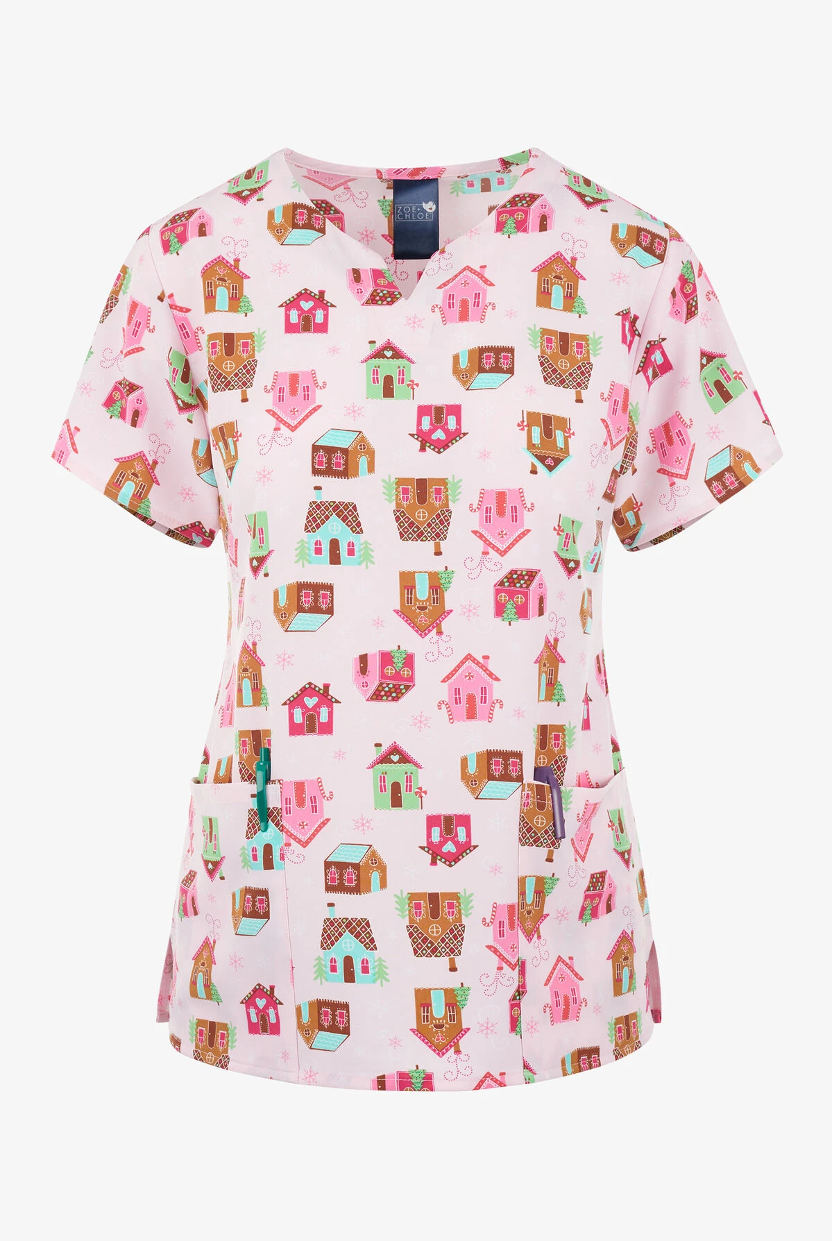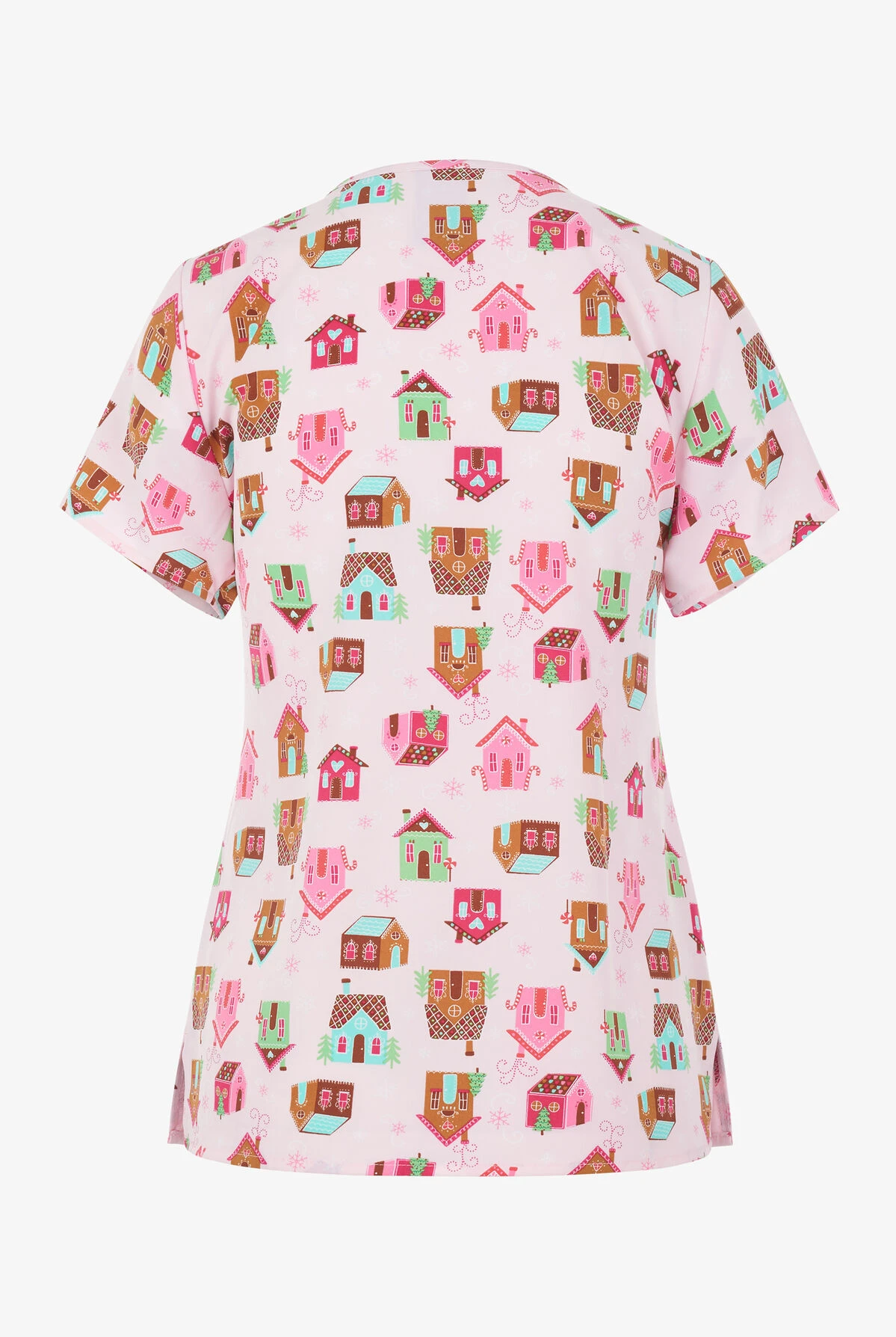 - Cute colorful cottages on a snowflake sprinkled Rose Blush background